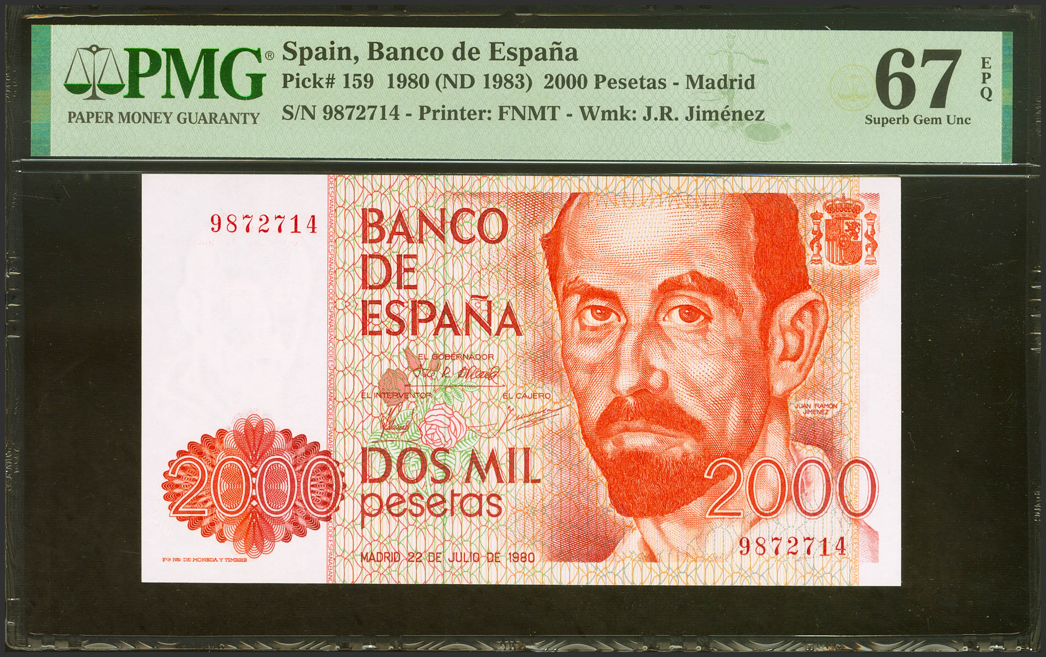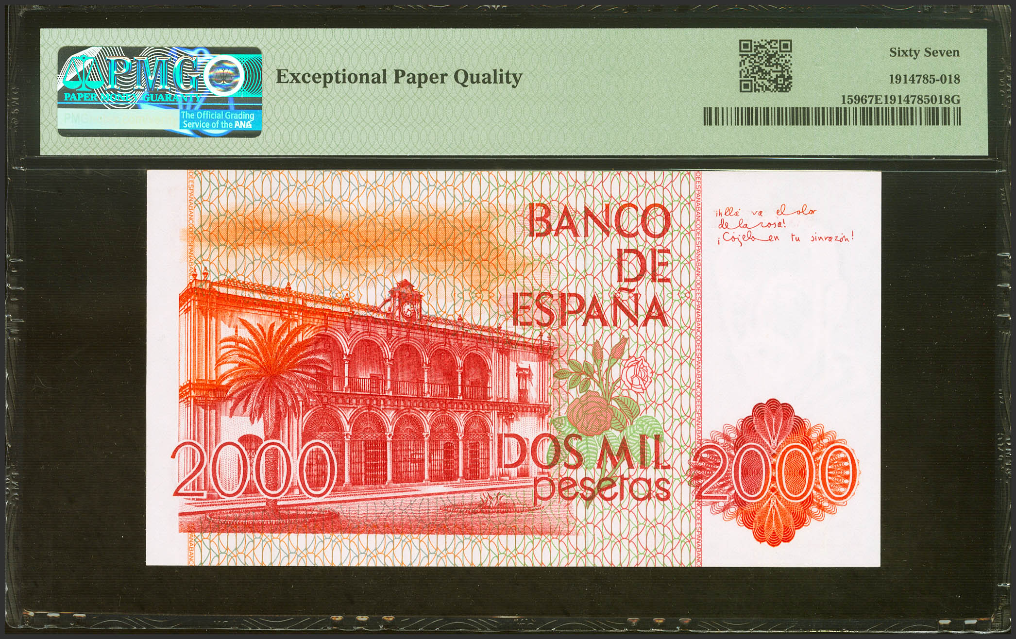 English 2000 Pesetas. July 22, 1980. No series. (Edifil 2021: 479, Pick: 159). Rare in this exceptional quality. Uncirculated. PMG67EPQ package.