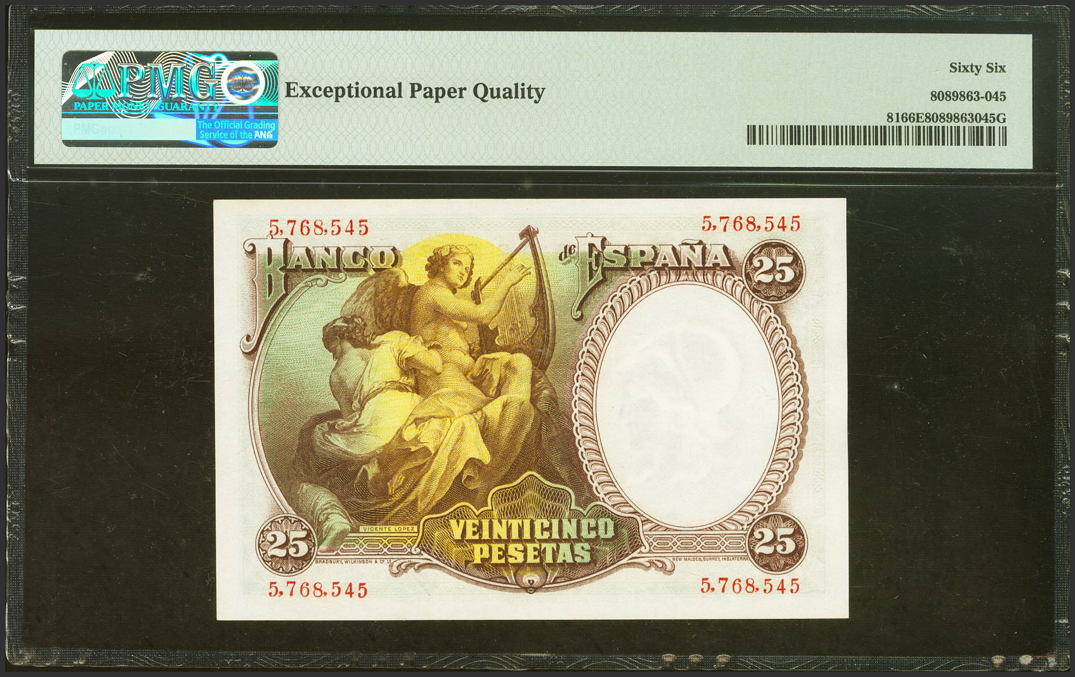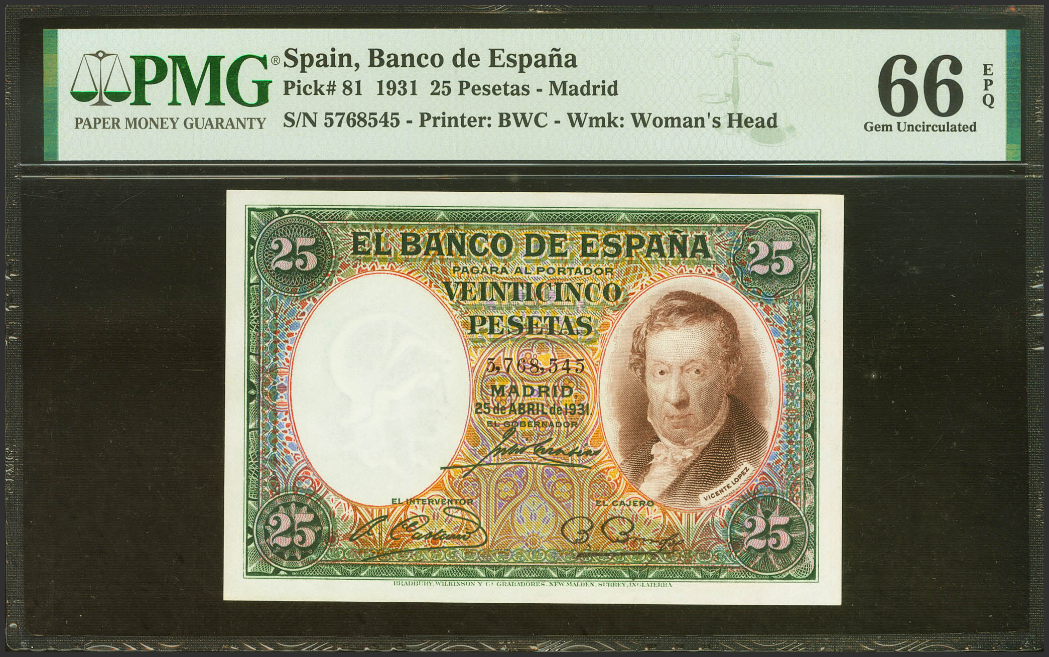 English 25 Pesetas. April 25, 1931. No series. (Edifil 2023: 358, Pick: 81). Unusual in this quality, original sizing. Uncirculated. PMG66EPQ package.