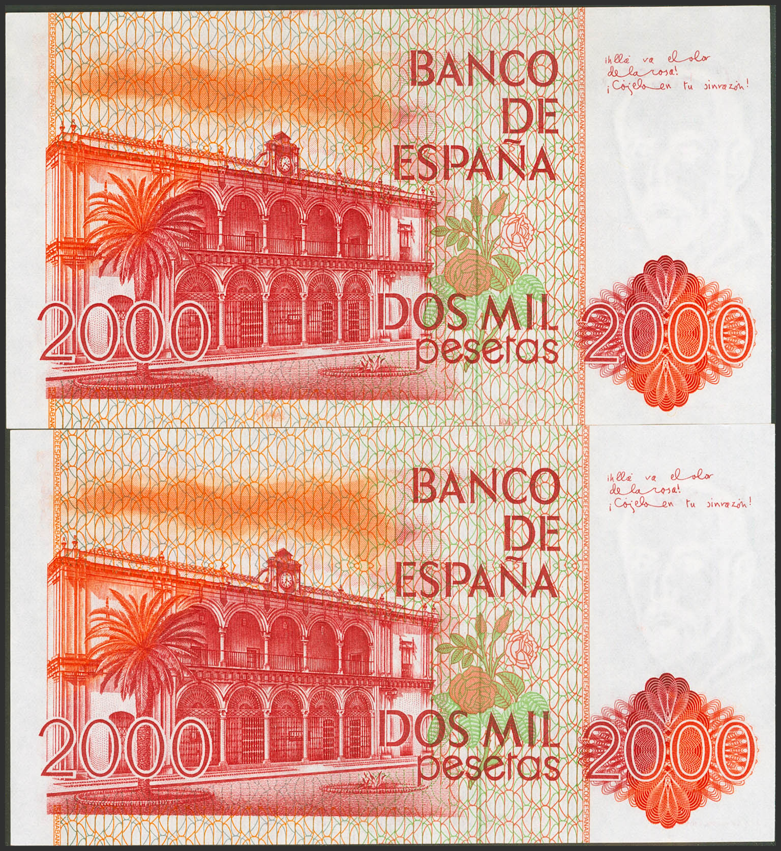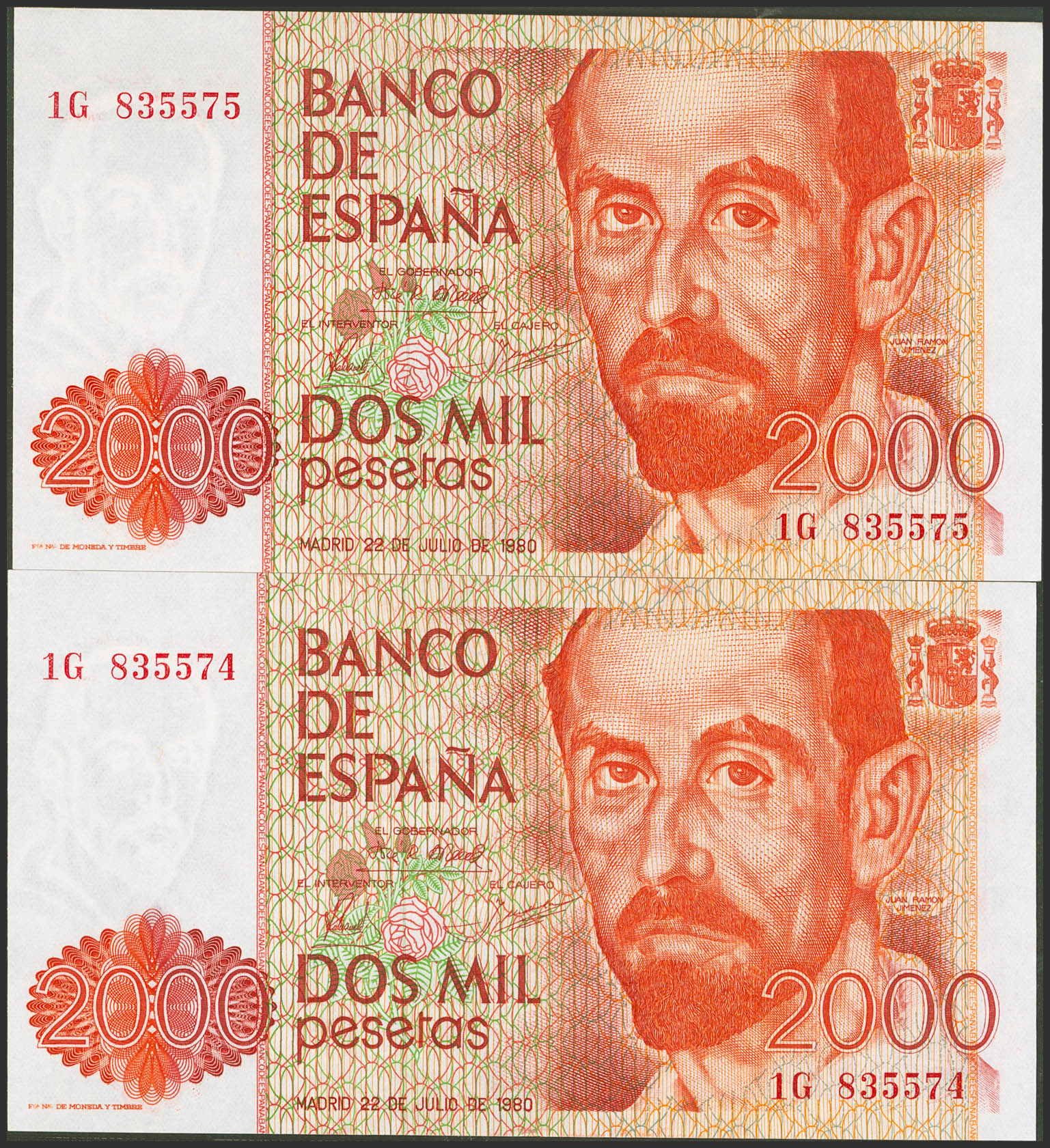 2000 Pesetas. July 22, 1980. Correlative couple. 1G series. (Edifil 2021: 479a). Uncirculated.