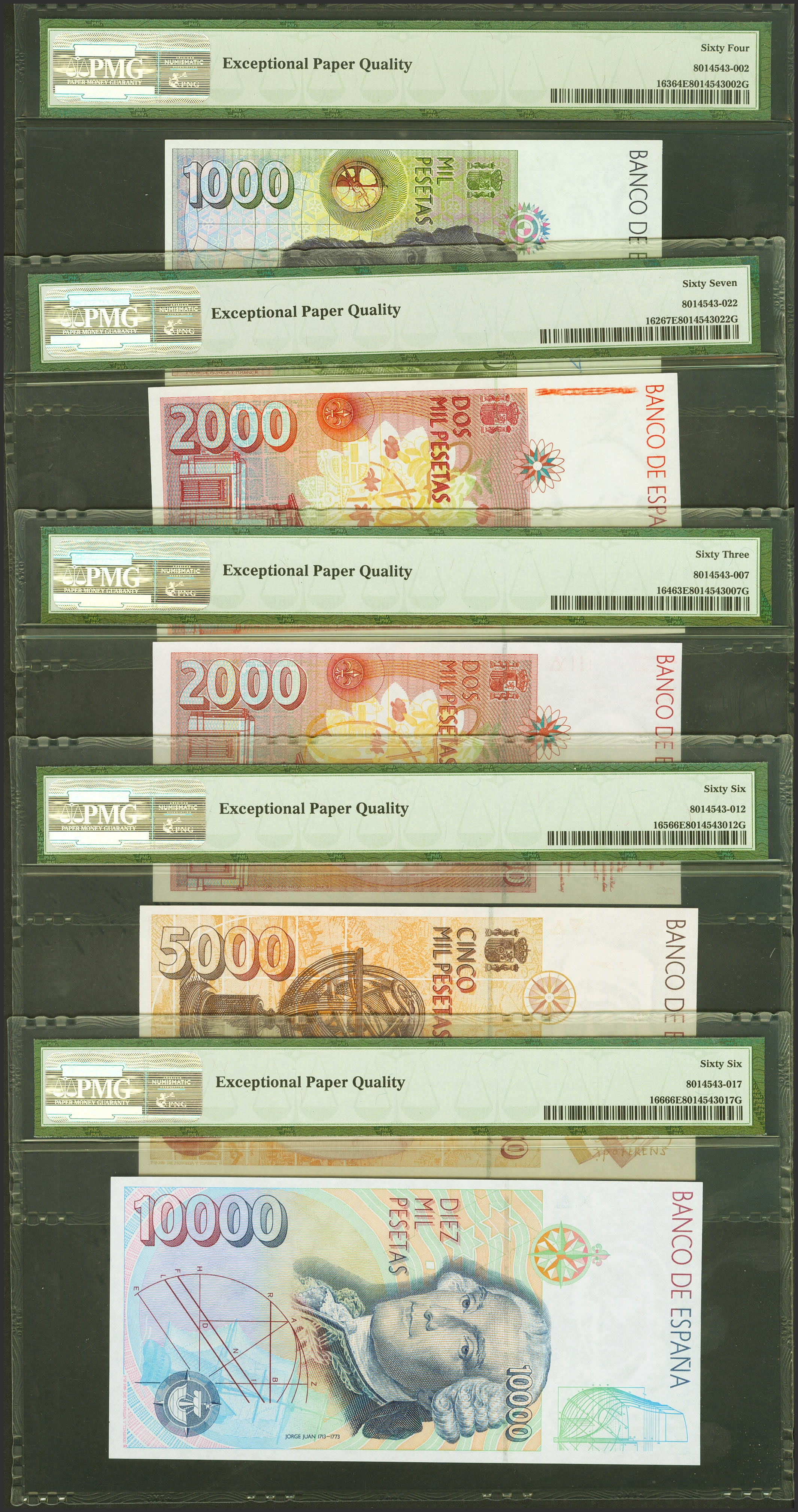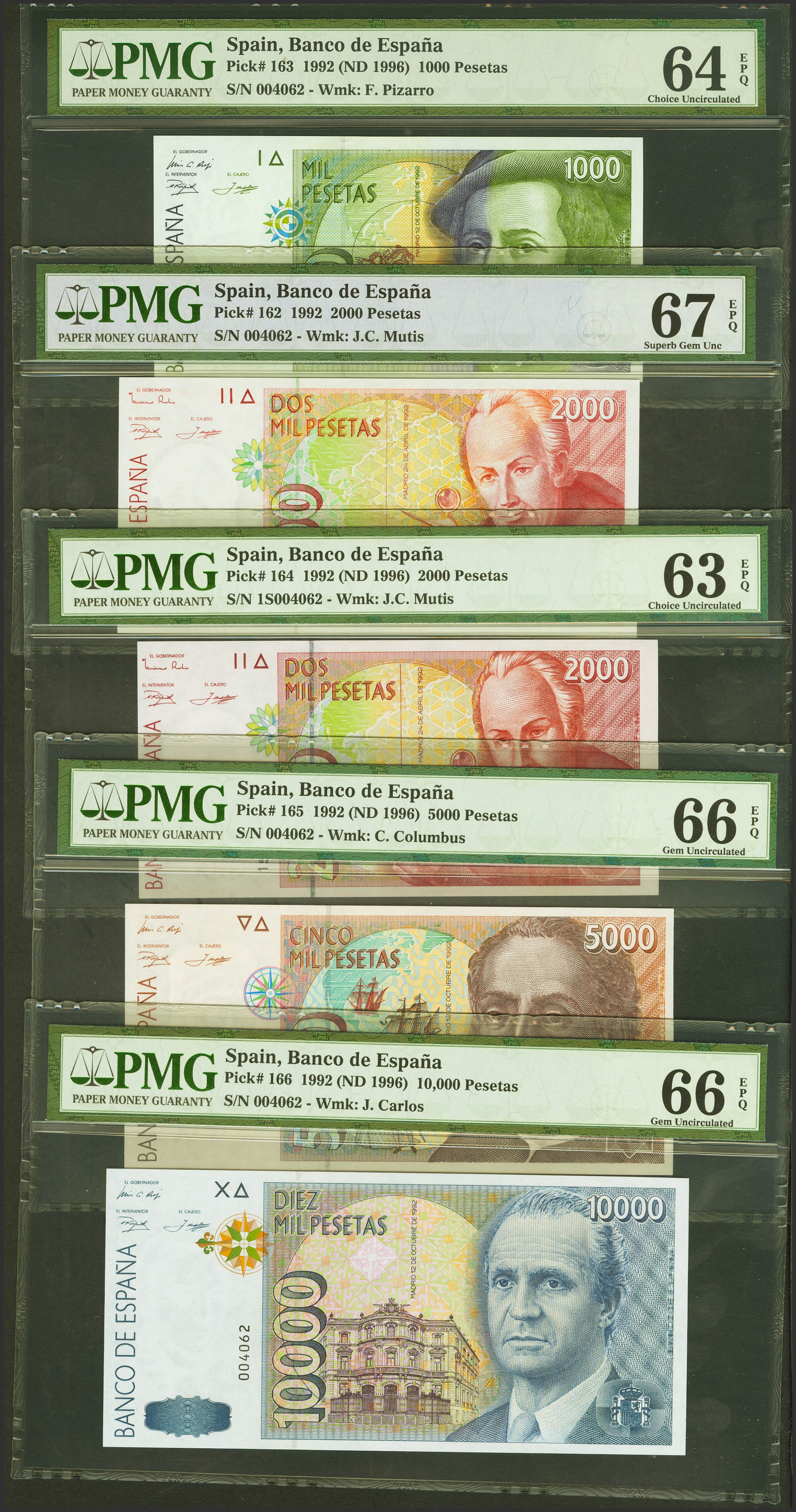 Complete series of the 1000, 2000 (plus another one with the numbering 1S), 5000 and 10000 Pesetas banknotes issued in 1992 and all of them with the same serial number Nº004062. (Edifil 2021: 482/85, 482A). Rare set. Uncirculated. Packaged PMG64EPQ, 67EPQ, 63EPQ, 66EPQ and 66EPQ, respectively.