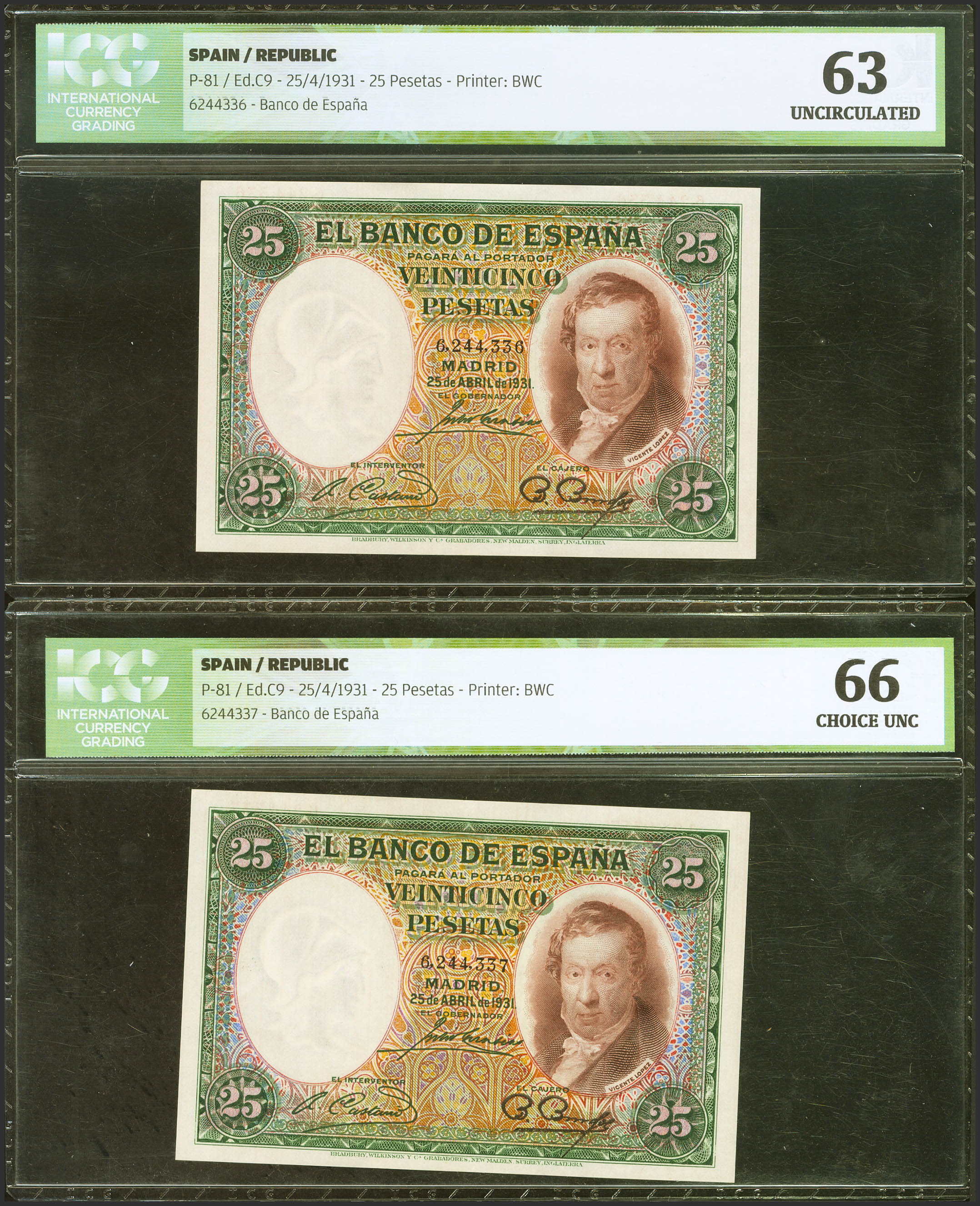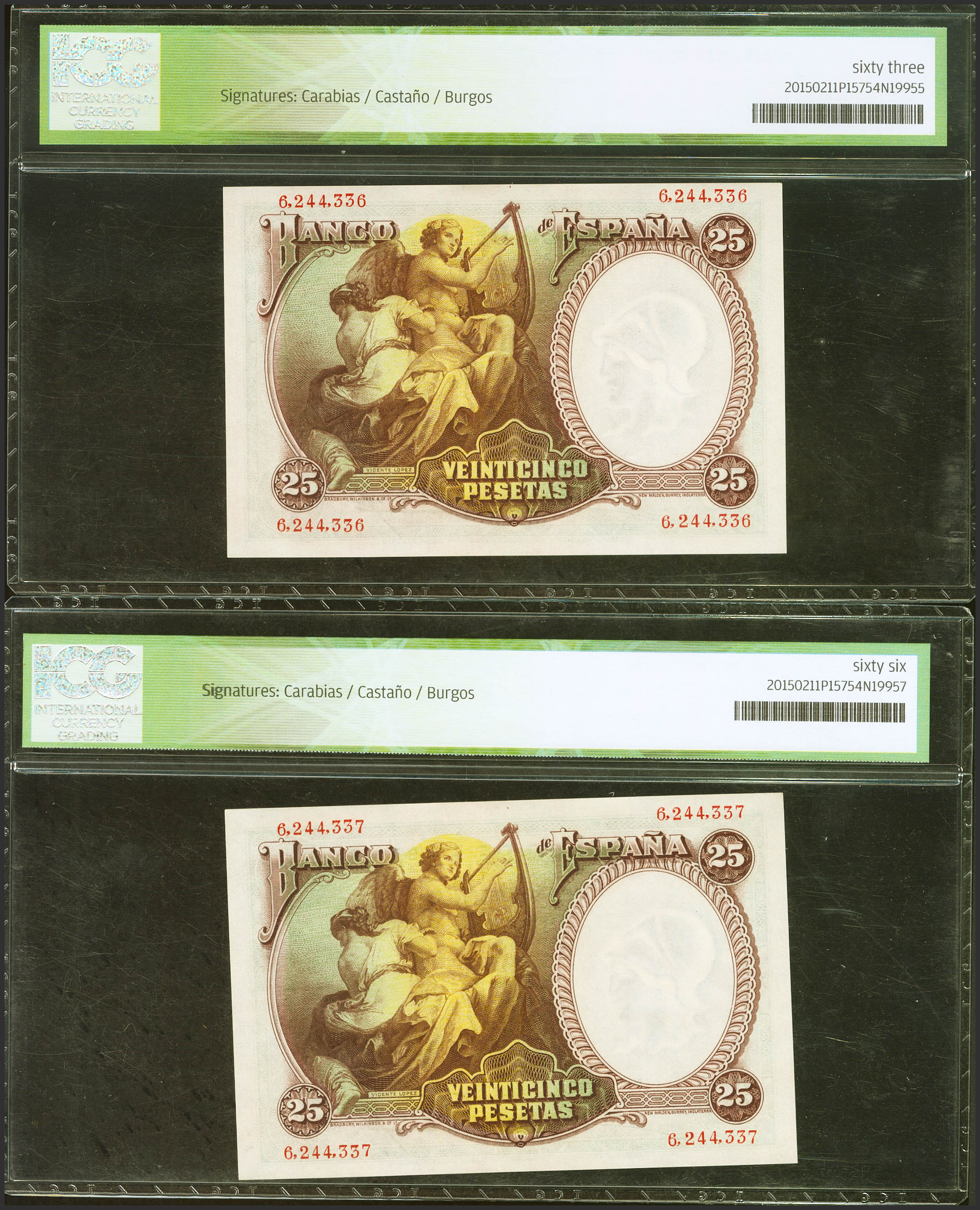 English 25 Pesetas. April 25, 1931. Correlative pair. No serie. (Edifil 2023: 358). Almost Uncirculated. ICG66/63 encapsulated.