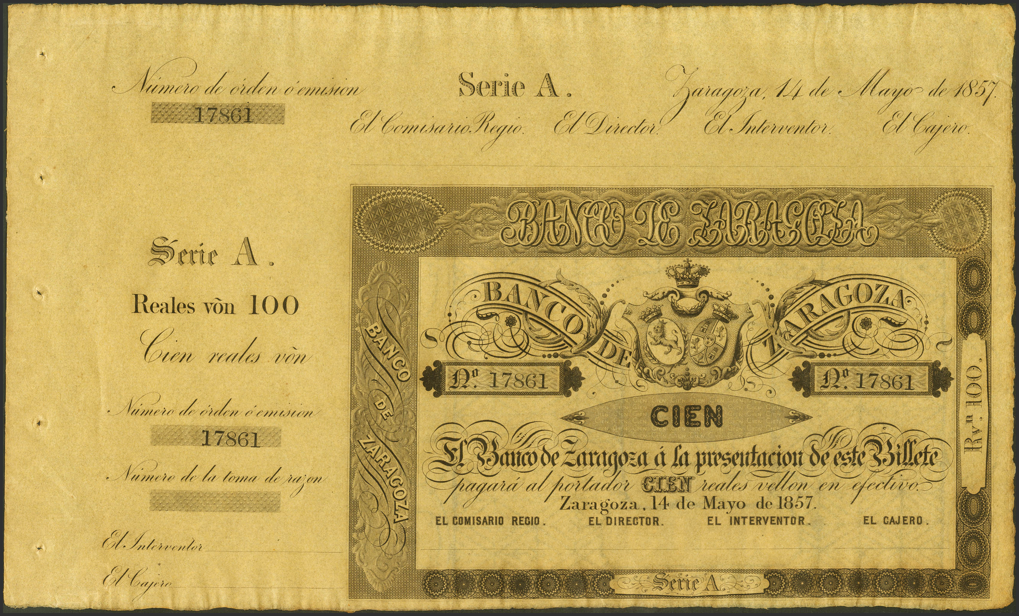 English 100 Reales. May 14, 1857. Bank of Zaragoza. Series A and with matrix. (Edifil 2023: 126B). Original sizing. Almost Uncirculated.