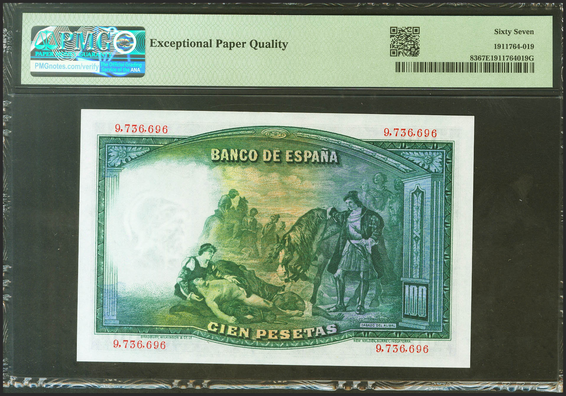 100 Pesetas. April 25, 1931. No series. (Edifil 2021: 360, Pick: 83). Rare in this exceptional quality, original sizing. Uncirculated. PMG67EPQ package.
