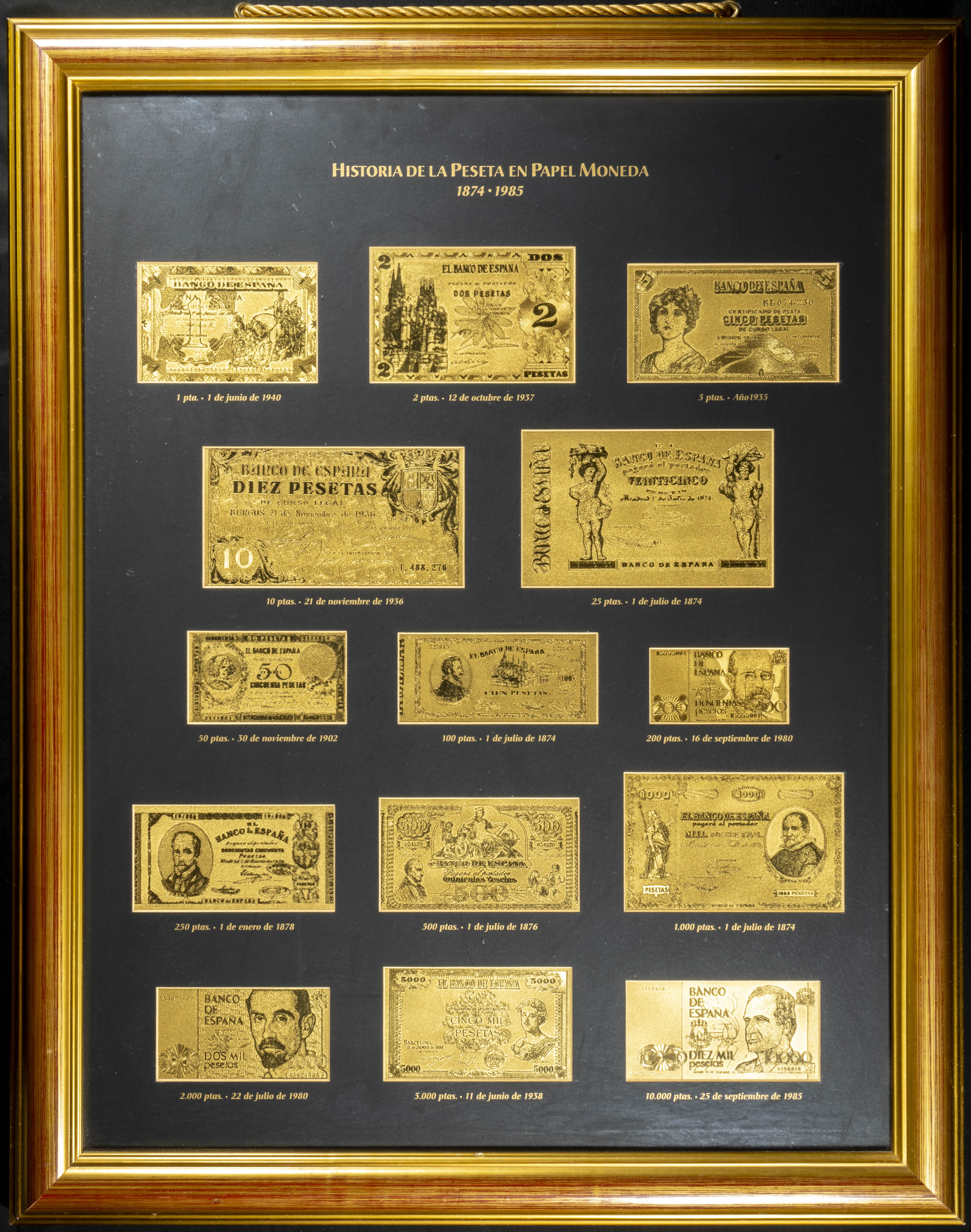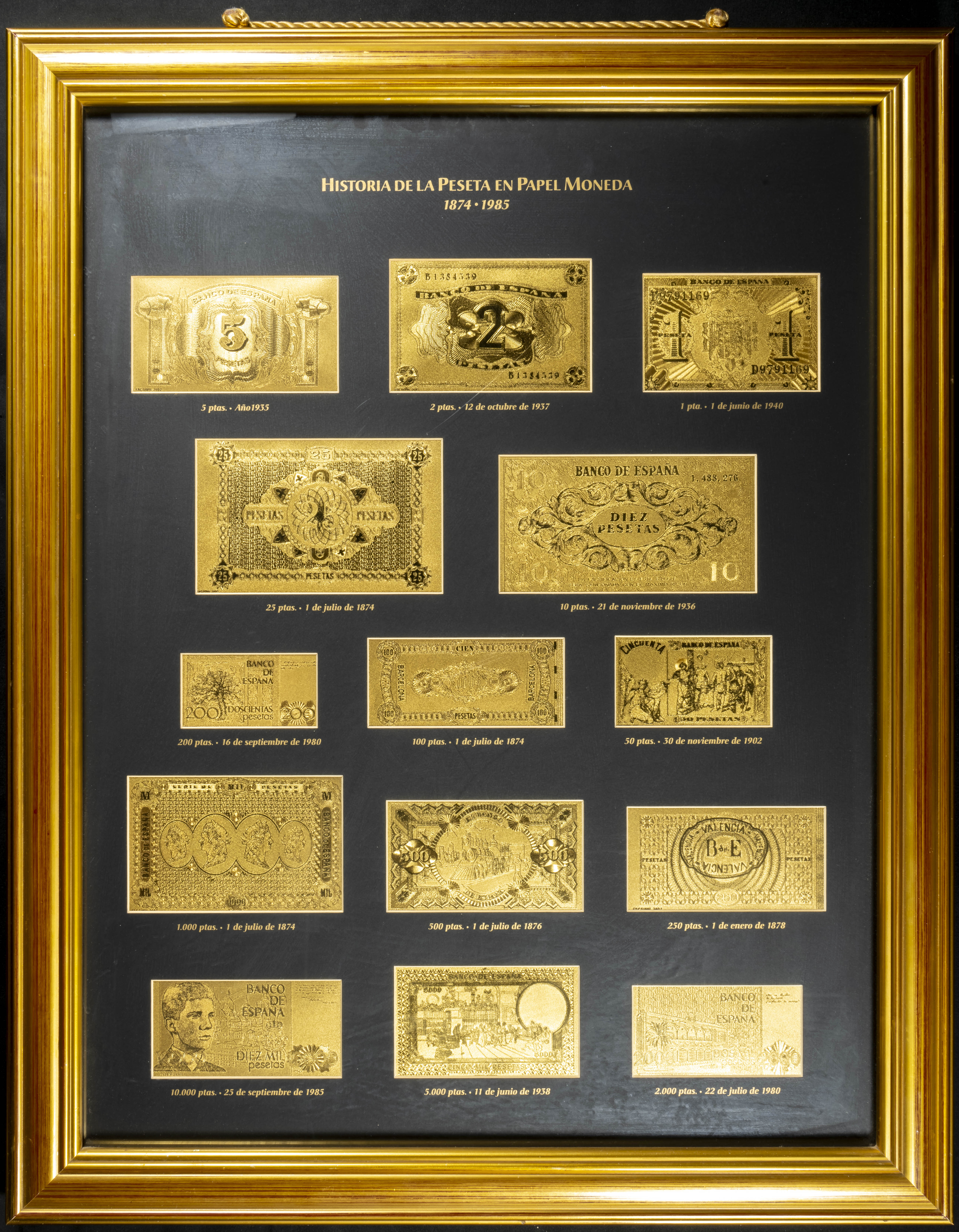 HISTORY OF THE PESETA IN PAPER MONEY. Spectacular display of 14 replicas of Spanish banknotes in silver, with sterling gold plating, from the period between 1874 and 1985. The banknotes are displayed in a golden frame, protected by methacrylate, measuring 56 cm x 71 cm. Perfect state of conservation. TO EXAMINE.