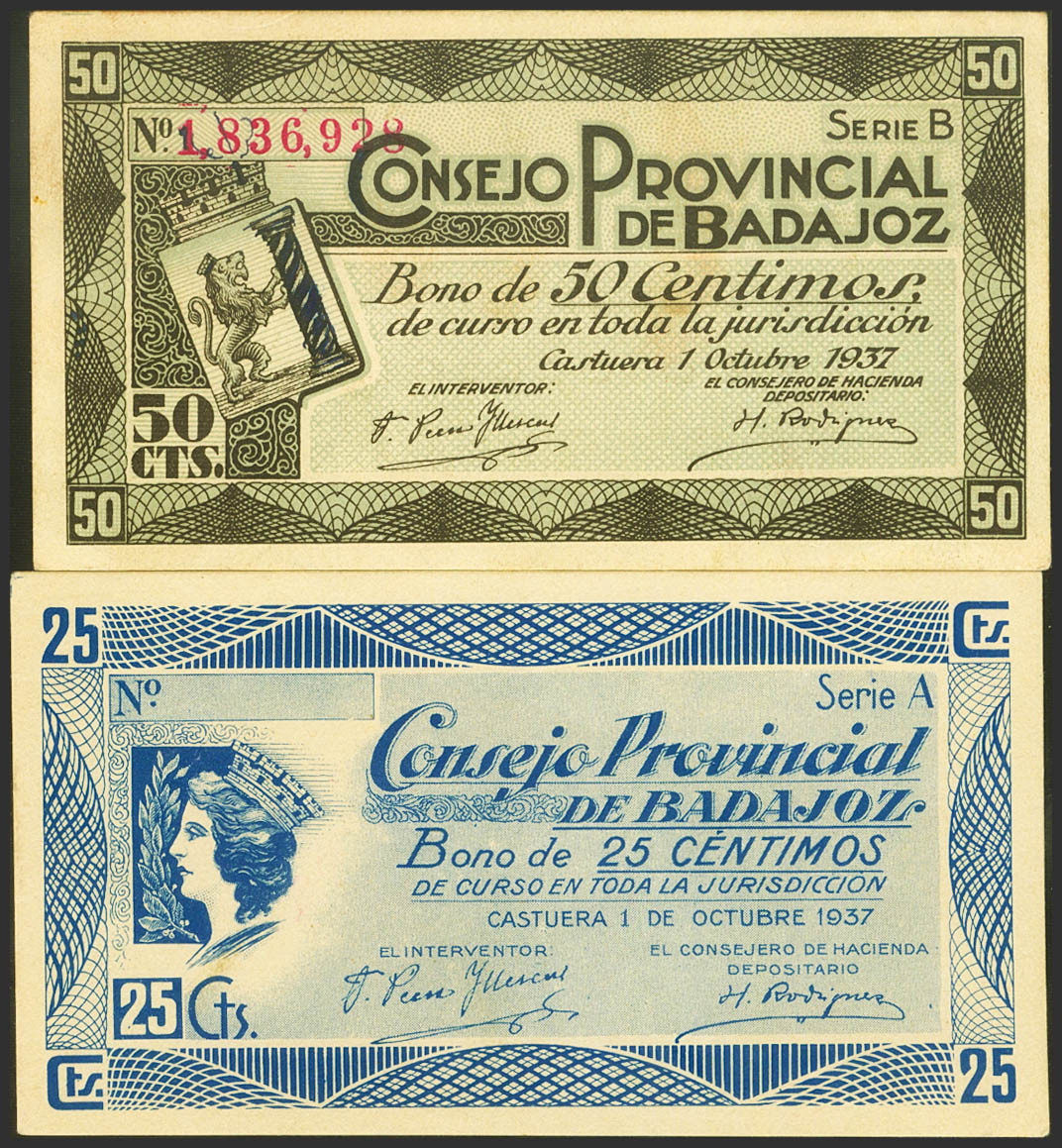 English BADAJOZ. 25 Cents and 50 Cents. October 1, 1937. Series A and B, on the back marked "For collectors only." (González: 834, 835). Almost Uncirculated-.