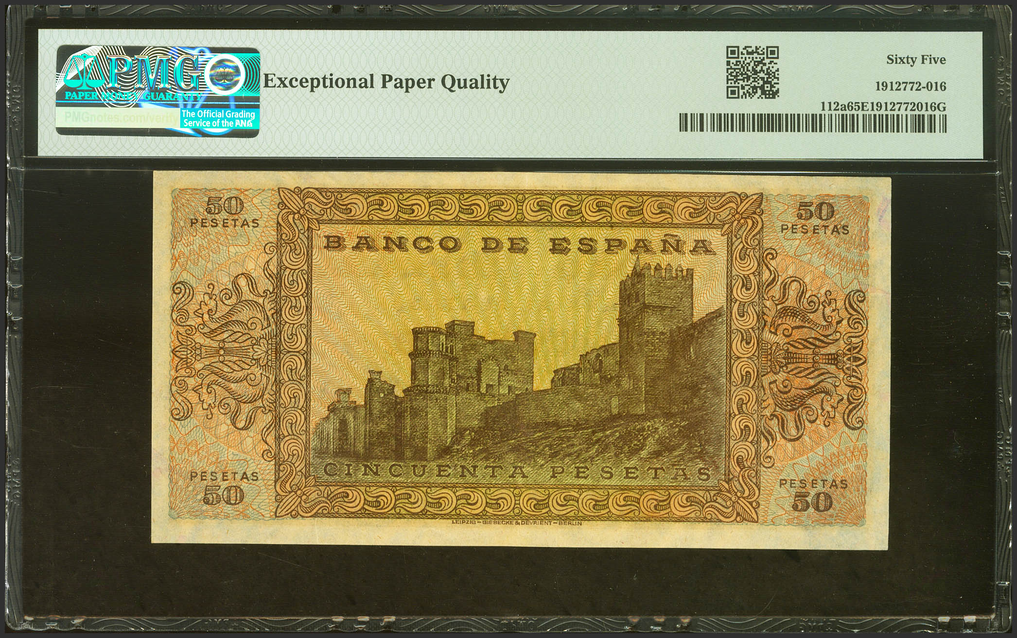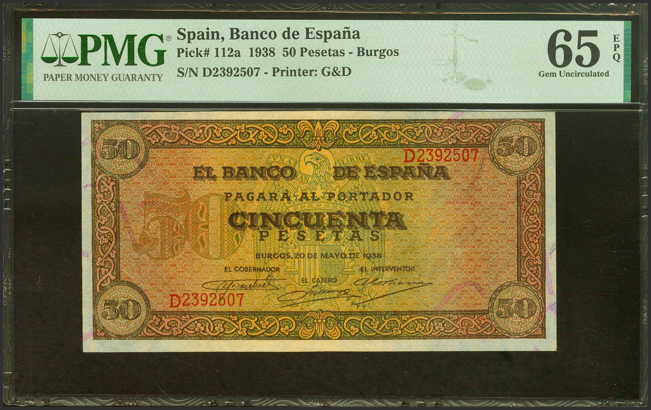 50 Pesetas. May 20, 1938. Series D. (Edifil 2021: 431a, Pick: 112a). Unusual in this exceptional quality, original sizing. Uncirculated. PMG65EPQ package.