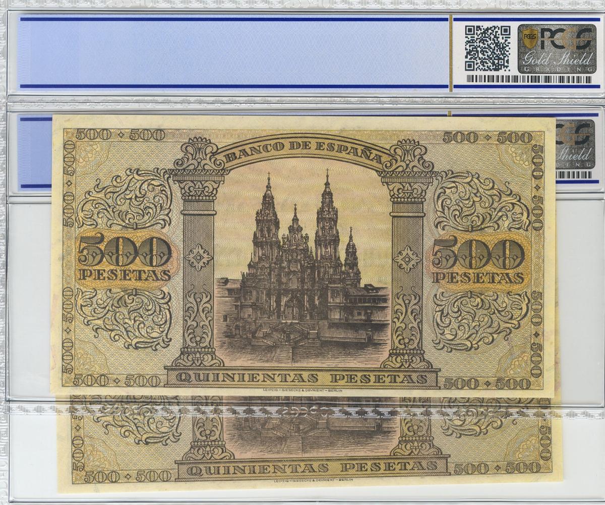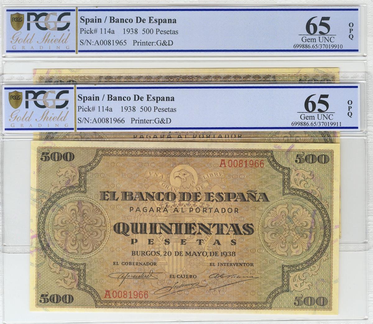 500 Pesetas. 20 de Mayo de 1938. Pareja correlativa. Serie A. (Edifil 2017: 433, Pick: 114a). Apresto original. Rarísimo. SC. Encapsulado PCGS65OPQ, para ambos billetes (sin duda una de las parejas con máxima graduación, probablemente la mejor graduación dada a una pareja de este billete)