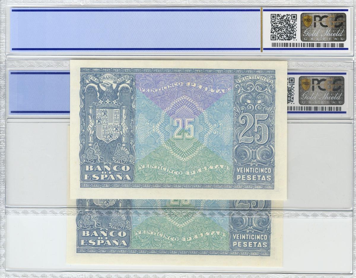 25 Pesetas. 9 de Enero de 1940. Pareja correlativa. Serie B. (Edifil 2017: 436a, Pick: 116a). Apresto original. Raro. SC. Encapsulado PCGS66OPQ, para ambos billetes (altísima graduación para una pareja, probablemente la mayor conocida).