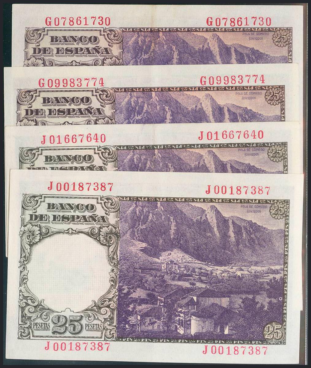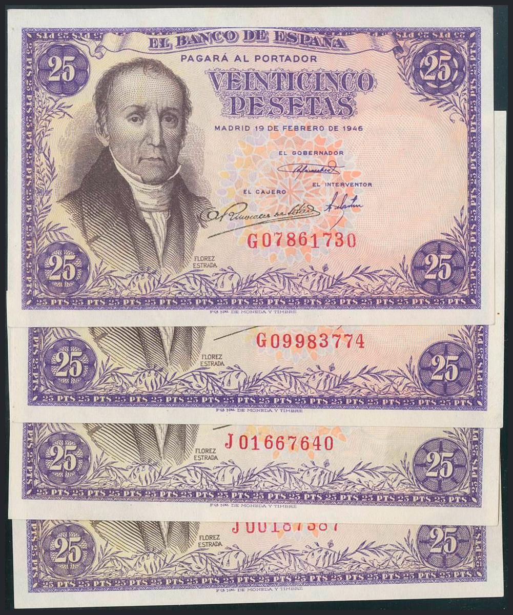 Conjunto de 4 billetes de 25 Pesetas, emitidos el 19 de Febrero de 1946, de las series G y J (Edifil 2017: 450a). EBC.