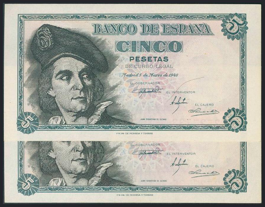 5 Pesetas. 15 de Marzo de 1948. Pareja correlativa. Serie F. (Edifil 2017: 455a). SC.