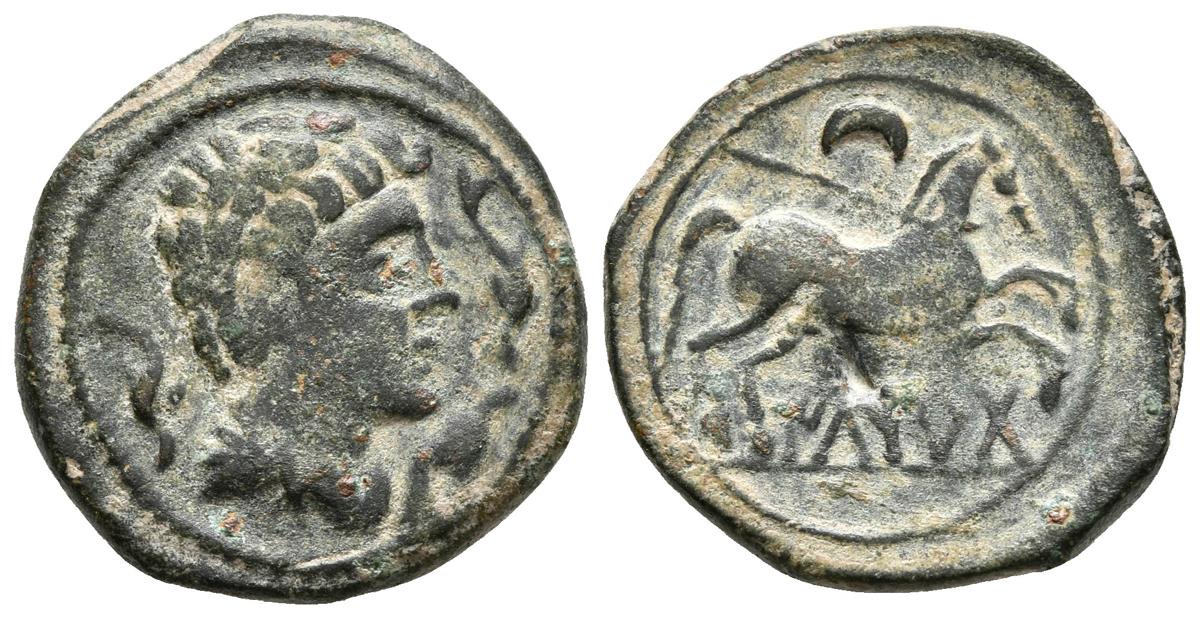 ILTIRTA. Semis. 220-200 a.C. Lleida (Cataluña). A/ Cabeza masculina con collar y manto a derecha, alrededor tres delfines. R/ Caballo con rienda suelta galopando a derecha, encima creciente, debajo, sobre línea, leyenda en ibérico ILTiRT. FAB-1472. Ae. 5,11g. MBC+.