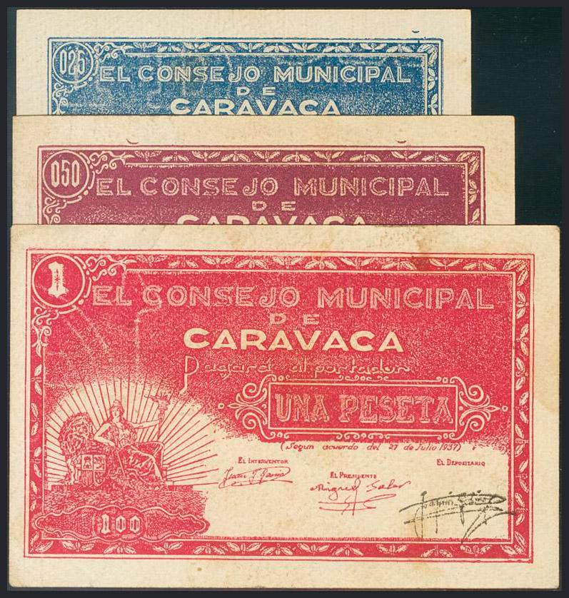 CARAVACA (MURCIA). 25 Céntimos, 50 Céntimos y 1 Peseta. (1937ca). Series G, A, D, respectivamente. (González: 1609/11). MBC.
