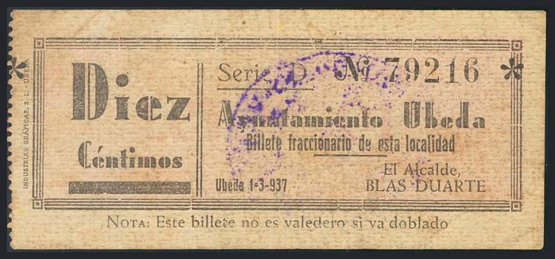UBEDA (JAEN). 10 Céntimos. 1 de Marzo de 1937. Tipo anverso fondo blanco. (González: 5197). Inusual. BC.