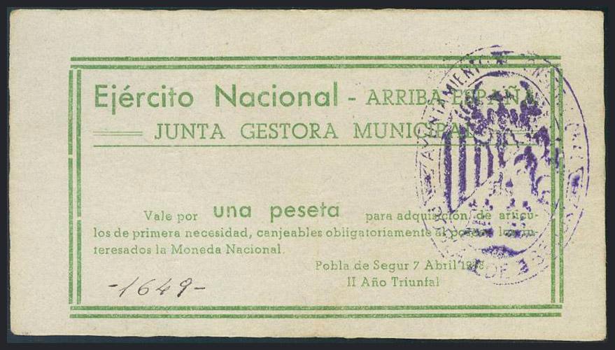 POBLA DE SEGUR (LERIDA). 1 Peseta. 7 de Abril de 1938. (González: 5932). MBC.