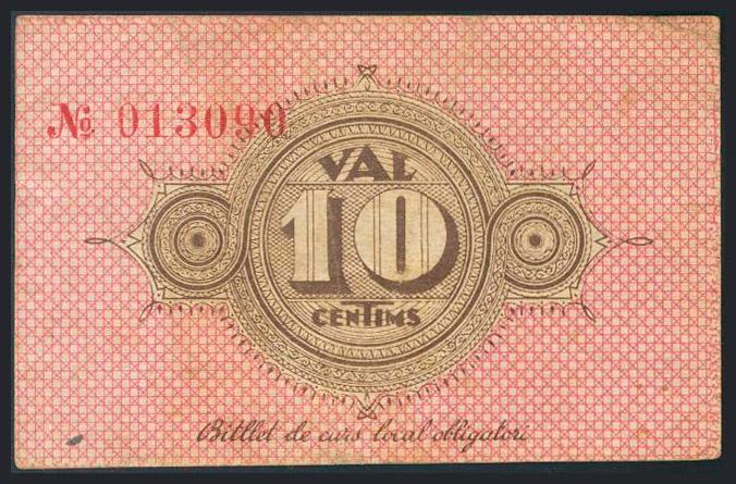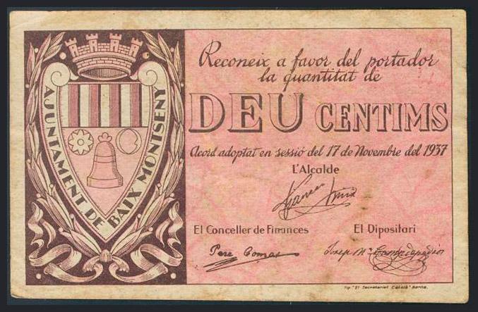 BAX MONTSENY (BARCELONA). 10 Céntimos. 17 de Noviembre de 1937. BC.