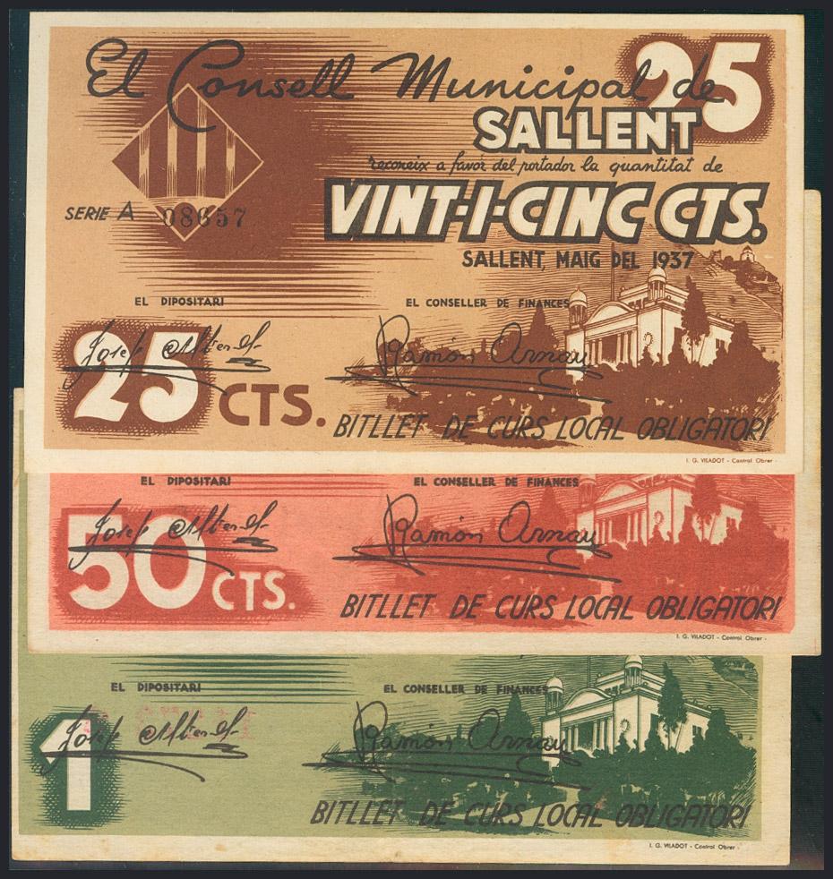 SALLENT (BARCELONA). Serie completa del 25 Céntimos, 50 Céntimos y 1 Peseta. Mayo de 1937. (González: 9821/23). MBC.