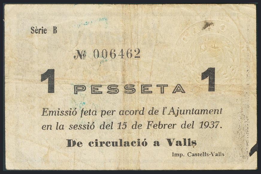 VALLS (TARRAGONA). 1 Peseta. 16 de Febrero de 1937. (González: 10538). BC.