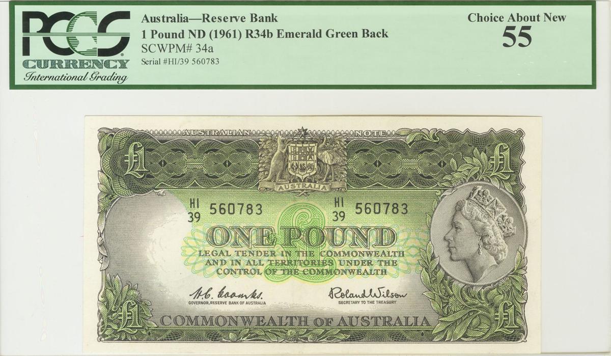 AUSTRALIA. 1 Libra. 1961. Serie HI 39. (Pick: 34a). Pertenece a la última emisión de billetes de la época predecimal australiana, en 1966 Australia pasa de la libra (sistema predecimal) al dólar (sistema decimal). Encapsulado PMG55. EBC+.