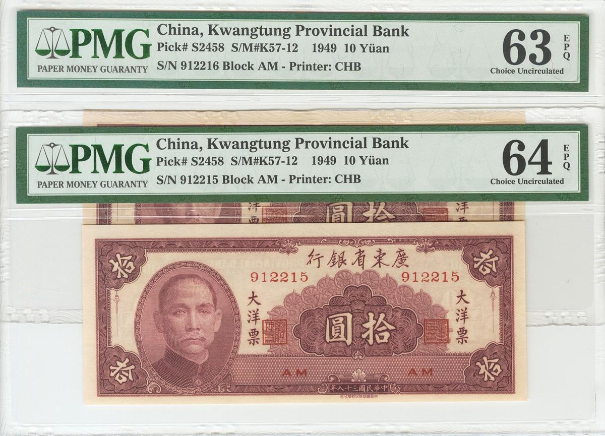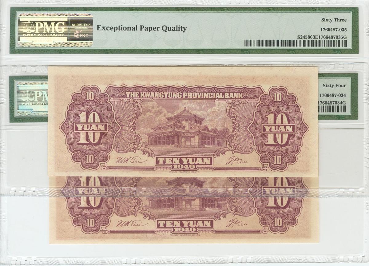 CHINA. KWANGTUNG. 10 Yuan. 1949. Pareja correlativa. Sin serie. (Pick: s2458). Encapsulado PMG64EPQ y PMG63EPQ.