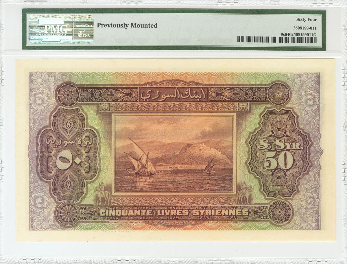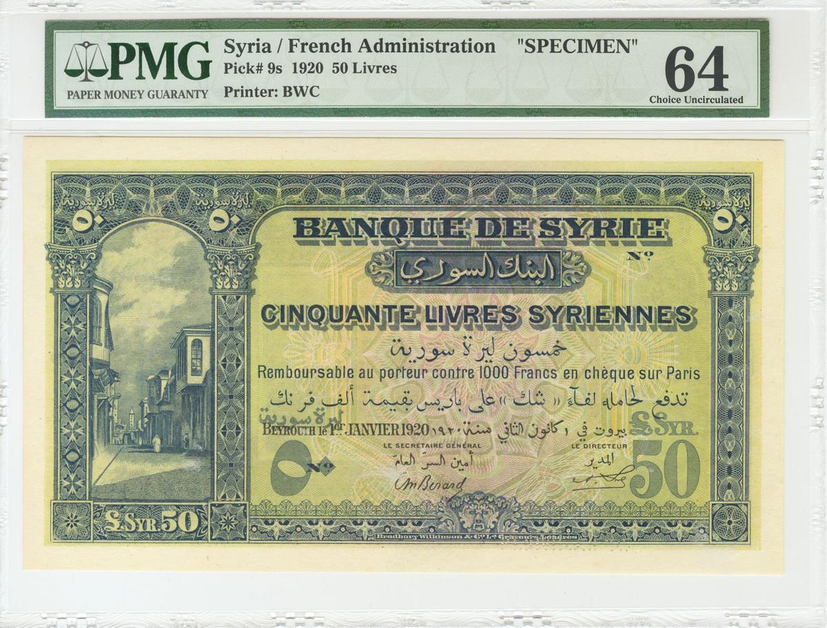 SIRIA. 50 Libras. 1 de Enero de 1920. Banque de Syrie "Specimen". (Pick: 9s). Espléndido y escasísimo ejemplar, emitido por la Administración Francesa destacada en aquel territorio tras la desintegración del Imperio Otomano propiciada tras la derrota en la I Guerra Mundial. Encapsulado PMG64 "Prevoiusly mounted", posiblemente el mejor conservado. SC.