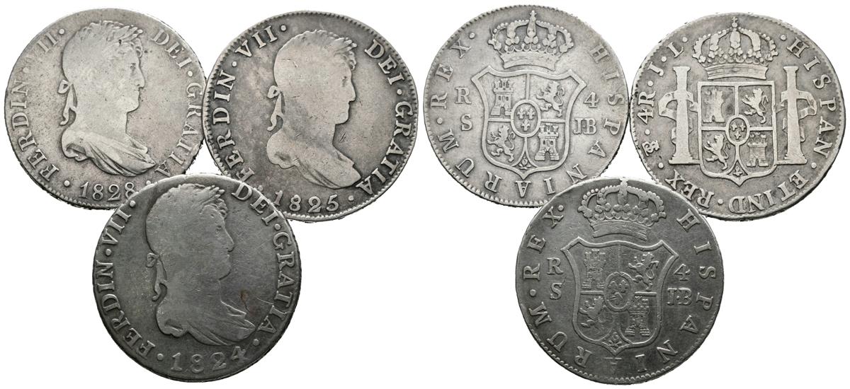 MONARQUIA ESPAÑOLA. Lote compuesto por 3 monedas de 4 Reales de Fernando VII, conteniendo: 1824 Sevilla JB; 1825 Potosí JL y 1828 Sevilla JB. Ar. BC+/MBC. A EXAMINAR.