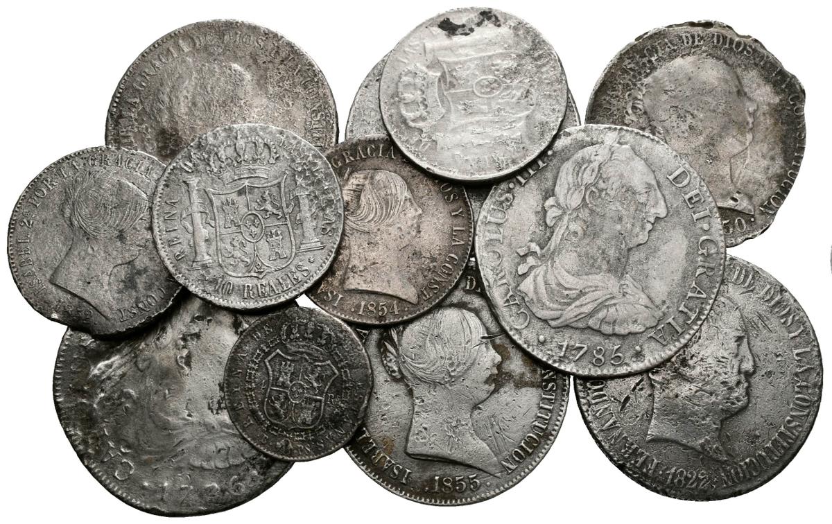 MONARQUIA ESPAÑOLA. Lote compuesto por 12 monedas de plata de Carlos III a Isabel II, conteniendo diferentes valores con variedad de años y cecas a clasificar. Oxidaciones marinas. A EXAMINAR.