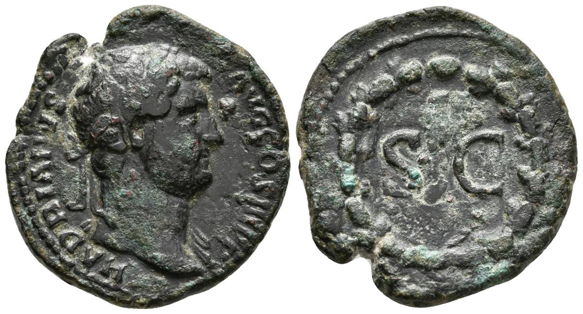 ADRIANO. As. 134-138 d.C. Roma. A/ Busto laureado a derecha con ligero drapeado sobre el hombro izquierdo. HADRIANVS AVG COS III P P. R/ Corona rodeando SC en el centro. RIC 831; Cohen 1394; BMC 1618. Ae. 10,12g. MBC. Escasa.