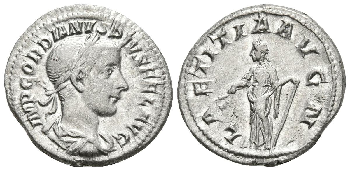 GORDIANO III. Denario. 238-244 d.C. Roma. A/ Busto laureado y drapeado con coraza a derecha. IMP GORDIANVS PIVS FEL AVG. R/ Laetitia estante a izquierda portando corona y antorcha. LAETITIA AVG N. RIC 113. Ar. 3,43g. MBC+.