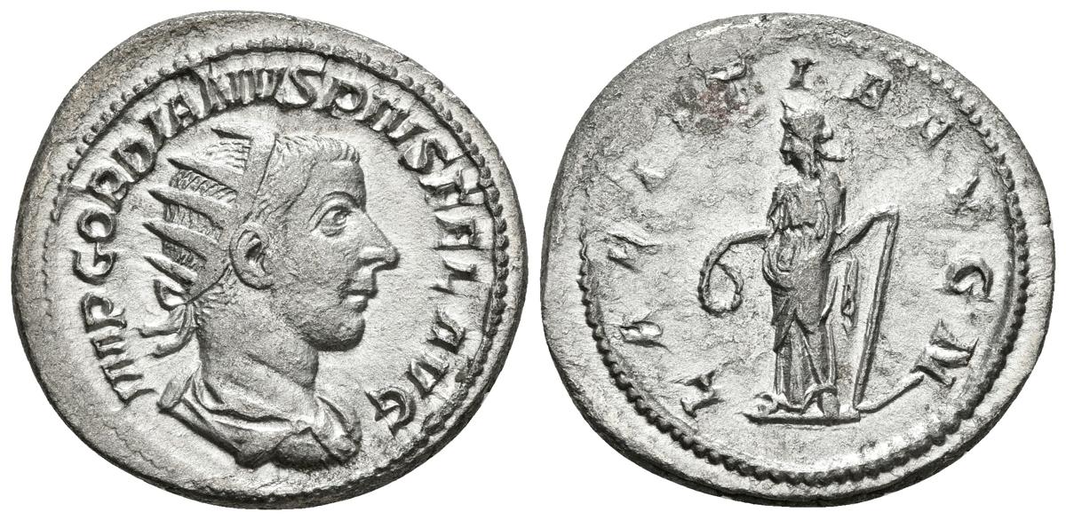 GORDIANO III. Antoniniano. 238-244 d.C. Roma. A/ Busto radiado y drapeado con coraza a derecha. IMP GORDIANVS PIVS FEL AVG. R/ Laetitia estante a izquierda portando corona y antorcha. LAETITIA AVG N. RIC 86; RSC 121. Ar. 4,69g. MBC+.