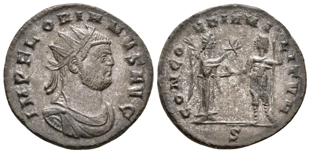 FLORIANO. Antoniniano. 276 d.C. Roma. A/ Busto radiado y drapeado con coraza a derecha. IMP C FLORIANVS AVG. R/ Victoria a izquierda sosteniendo palma y ofreciendo corona al emperador a derecha, este porta cetro y extiende su mano para recibir la corona. CONCORDIA MILITVM, en exergo S. RIC 116; RIC Online 4533 Ae. 4,16g. MBC+.