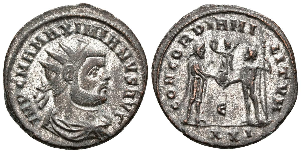 MAXIMIANO. Antoniniano. 293-294 d.C. Cyzicus. A/ Busto radiado y con coraza a derecha. IMP C M A MAXIMIANVS PF AVG. R/ Júpiter estante a izquierda portando cetro, presentando victoria sobre globo a emperador frente a él, portando cetro largo y entre ellos E. CONCORDIA MILITVM, en exergo XXI. RIC V 607. Ae. 3,91g. Conserva el plateado original. MBC+.