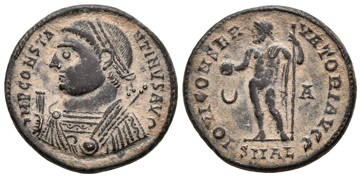 CONSTANTINO I. Follis. 317-320 d.C. Alexandría. A/ Busto laureado a izquierda portando globo, cetro y mappa. IMP CONSTANTINVS AVG. R/ Júpiter estante a izquierda portando cetro y globo, en el campo izquierdo creciente y en la derecha A. IOVI CONSERVATORI AVGG, en exergo SMAL. RIC 22. Ae. 3,44g. MBC+.