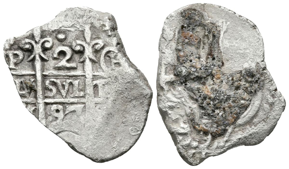 CARLOS II. 2 Reales. 1697. Potosí CH. Unico año de este ensayador. Doble fecha. Cal-629. Ar. 4,90g. Concreciones marinas en anverso. BC+/MBC-. Muy rara.