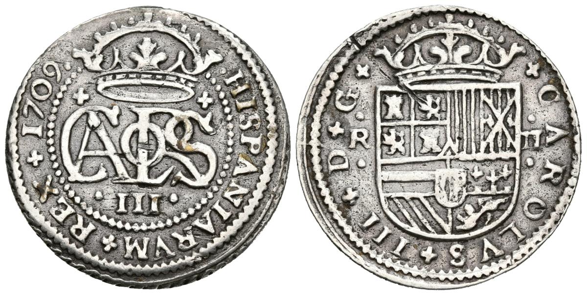 CARLOS III, Pretendiente. 2 Reales. 1709. Barcelona. Cal-25. Ar. 4,78g. Leve soldadura en el canto cuidadosamente reparada. MBC+.