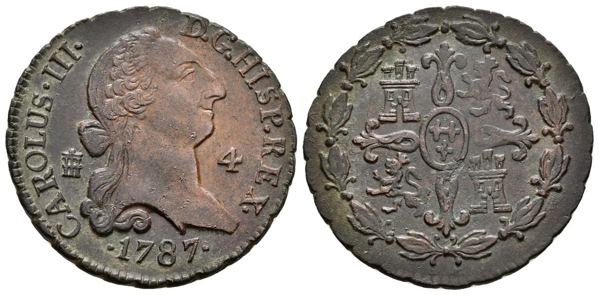 CARLOS III. 4 Maravedís. 1787. Segovia. Cal-1912. Ae. 5,00g. Bella. MBC+/EBC-.