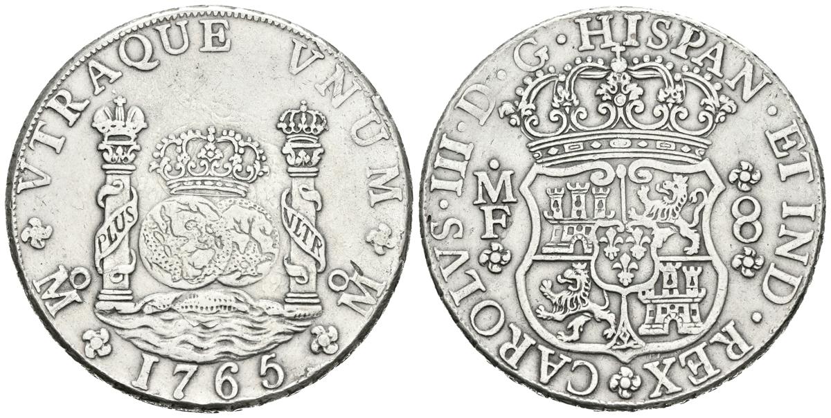 CARLOS III. 8 Reales. 1765. México MF. Columnario. Cal-901. Ar. 27,22g. Acuñada sobre otro columnario. MBC+.