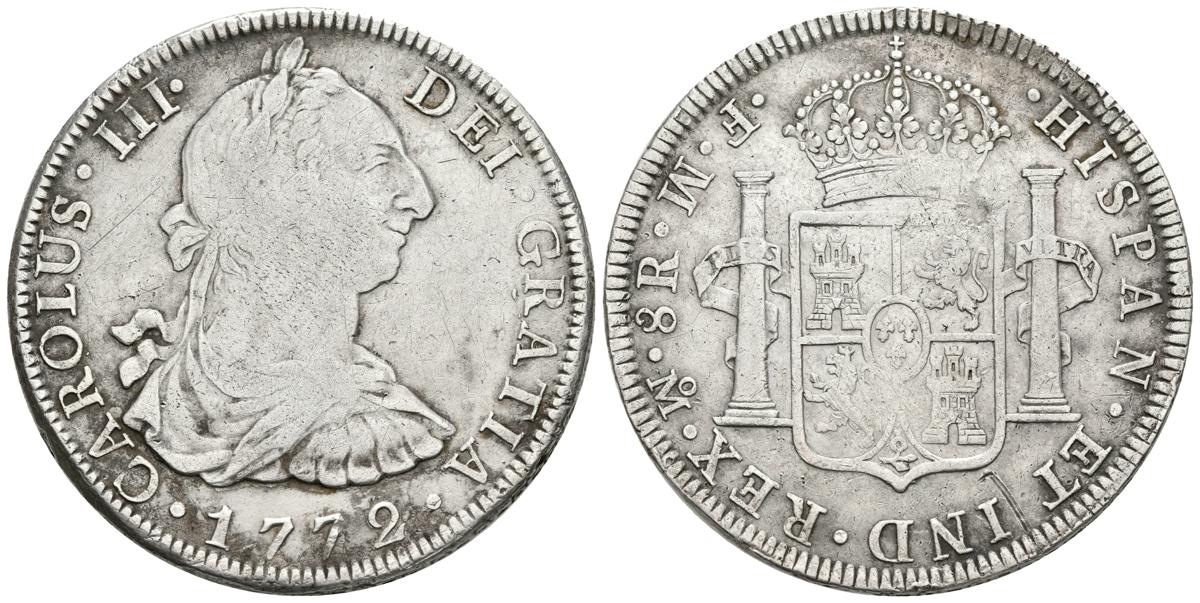 CARLOS III. 8 Reales. 1772. México FM. Ceca y ensayadores invertidos. Primer año de este busto. Cal-916. Ar. 26,77g. MBC-.