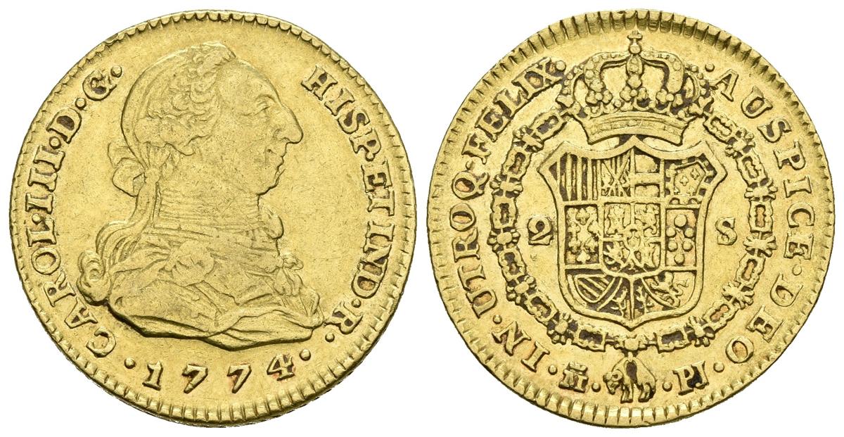 CARLOS III. 2 Escudos. 1774/3. Madrid PJ. Cal-447var. Au. 6,80g. MBC-/MBC.