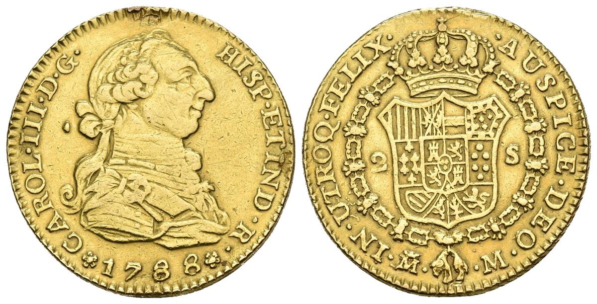 CARLOS III. 2 Escudos. 1788/78 sobrefecha. Madrid M. Cal-459 No cita esta sobrefecha. Au. 6,75g. Sirvió como joya. MBC-/MBC.