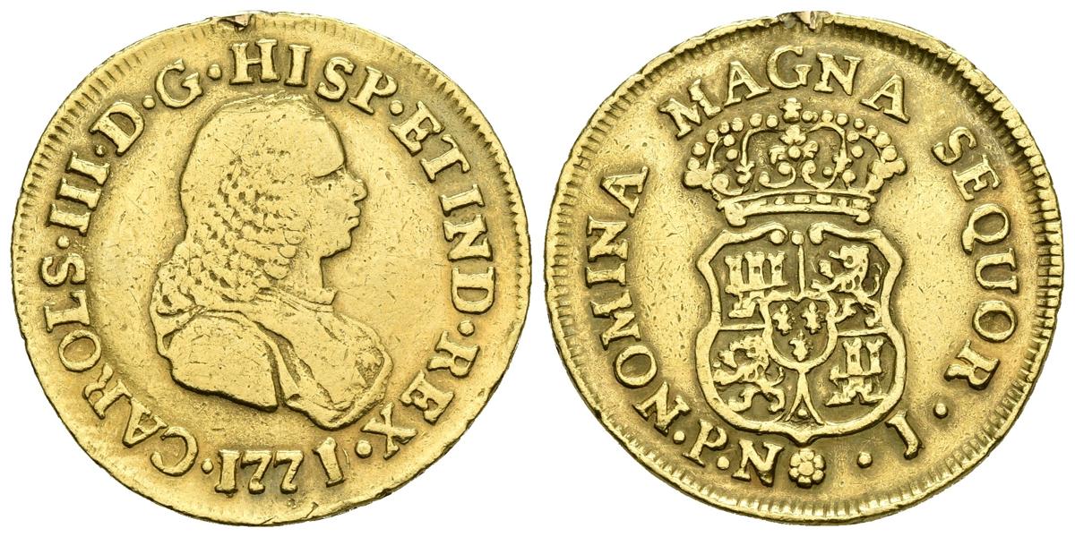 CARLOS III. 2 Escudos. 1771/0. Popayán J. Busto de Fernando VI. Sin indicación de valor. Cal-501var. Au. 6,63g. Soldadura a las 12h. MBC-/MBC. Rara.