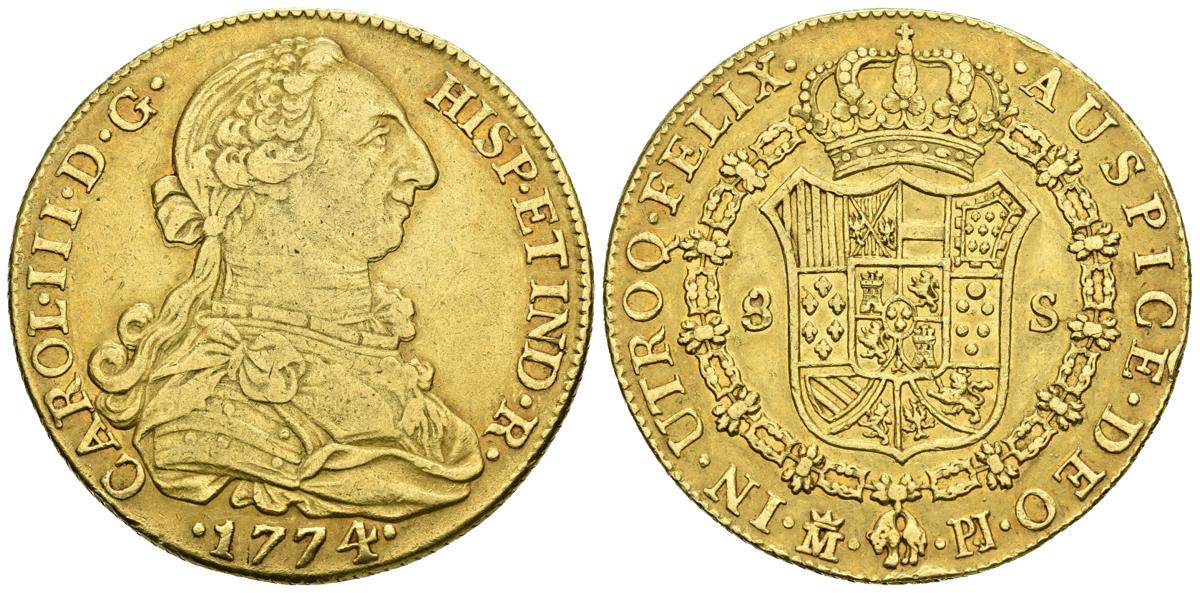 CARLOS III. 8 Escudos. 1774. Madrid PJ. Punto entre los ensayadores. Cal-54; Cal. Onza 723. Au. 26,95g. MBC+. Rara.