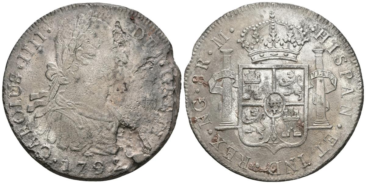CARLOS IV. 8 Reales. 1792. Guatemala M. Cal-621. Ar. 24,38g. Oxidaciones marinas. BC/MBC-. Escasa.