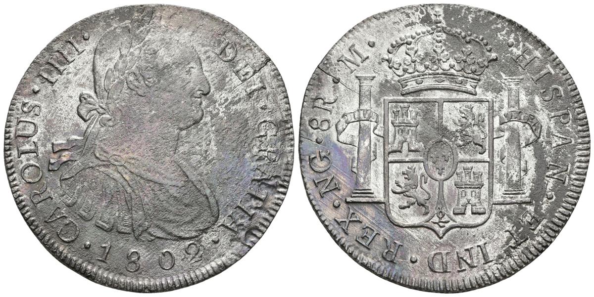 CARLOS IV. 8 Reales. 1802. Guatemala M. Cal-633. Ar. 25,08g. Oxidaciones marinas y pátina gris con irisaciones. MBC-.