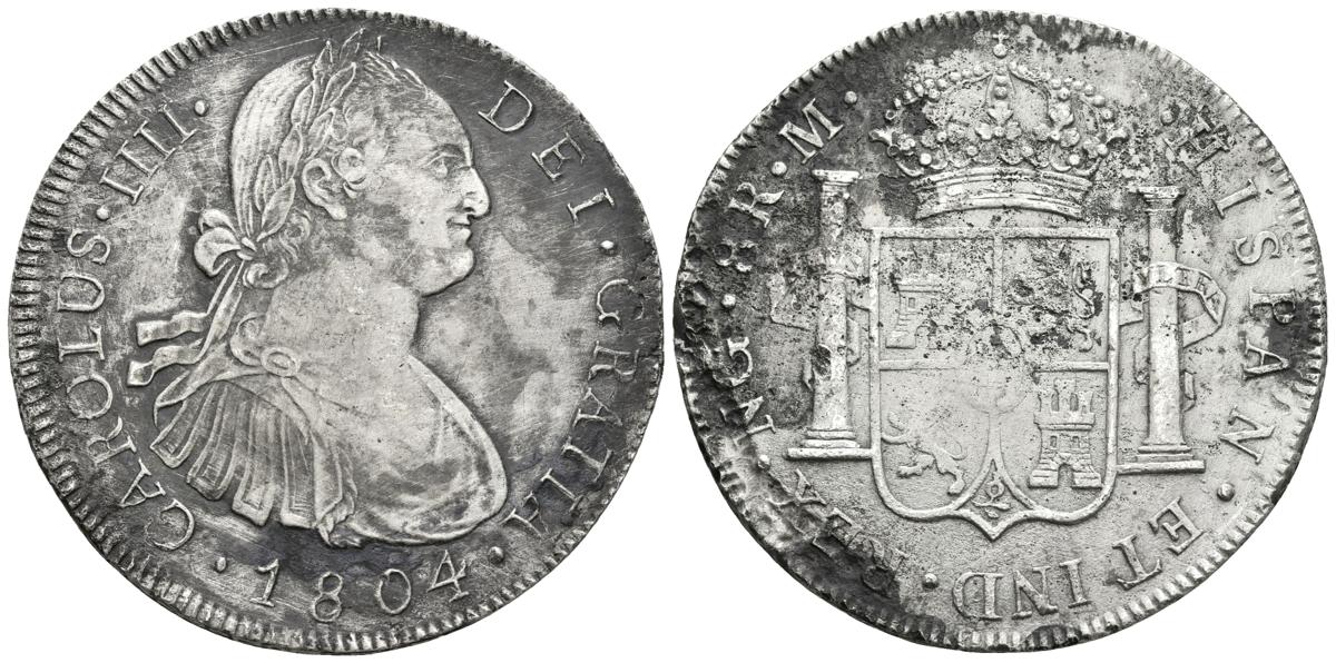 CARLOS IV. 8 Reales. 1804. Guatemala M. Cal-635. Ar. 25,82g. Oxidaciones marinas. MBC+/MBC-. Escasa.