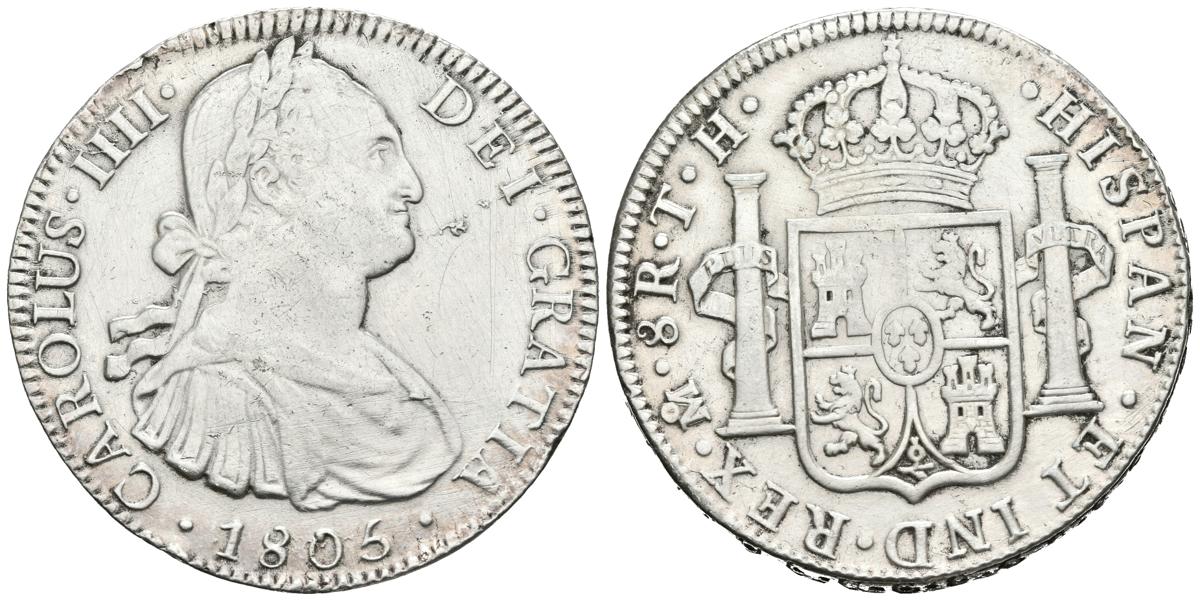 CARLOS IV. 8 Reales. 1805. México TH. Cal-703. Ar. 26,77g. Reverso limpiado. MBC-.