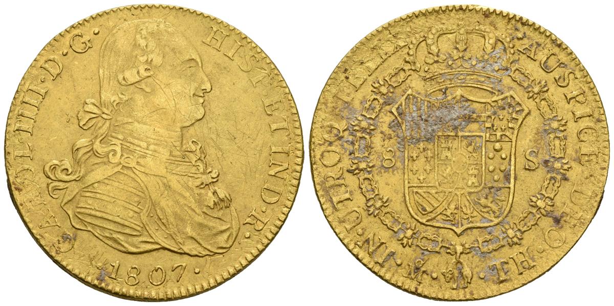 CARLOS IV. 8 Escudos. 1807. México TH. Cal-63; Cal. Onza 1044. Au. 26,90g. Incrustaciones marinas y rayas por limpieza. MBC.