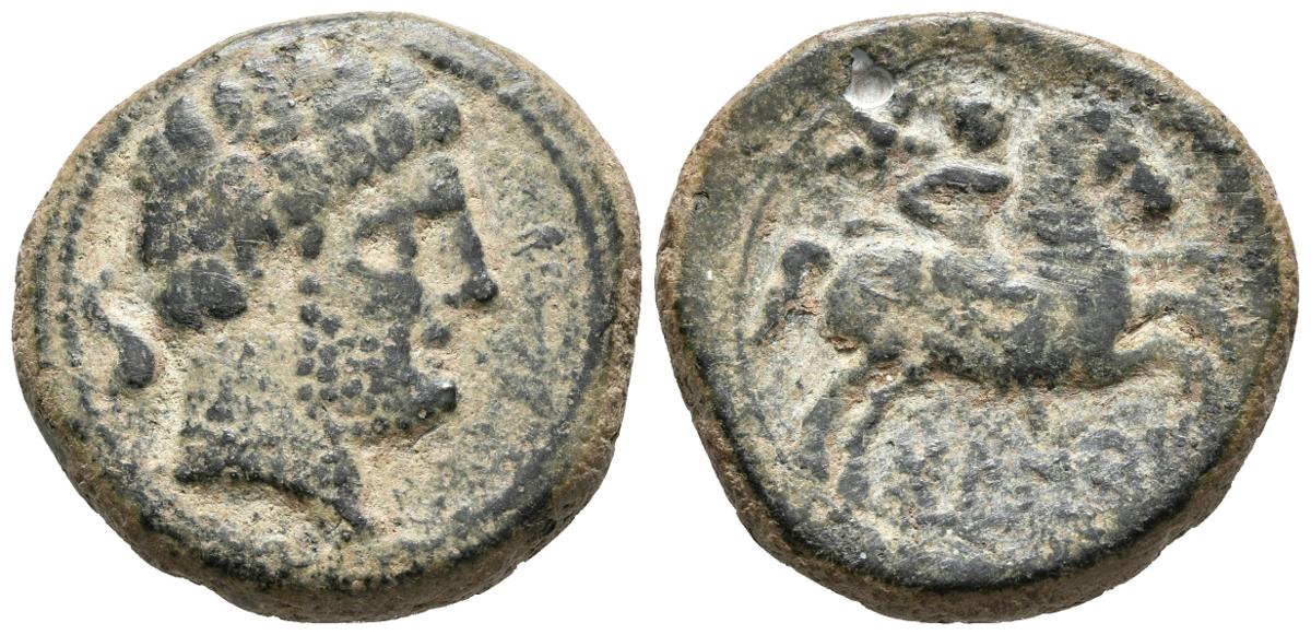 BOLSCAN. As. 180-20 a.C. Huesca. A/ Cabeza barbada a derecha, detrás delfín. R/ Jinete con lanza a derecha, encima estrella. FAB-1918. Ae. 9,74g. MBC.