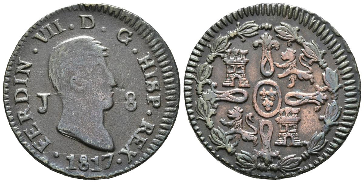 FERNANDO VII. 8 Maravedís. 1817. Jubia. Cal-1550. Ae. 9,53g. Bonita pátina irisada. MBC-/MBC+.