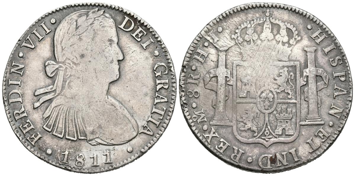 FERNANDO VII. 8 Reales. 1811. México HJ. Busto imaginario. Cal-545. Ar. 26,81g. MBC-/MBC.