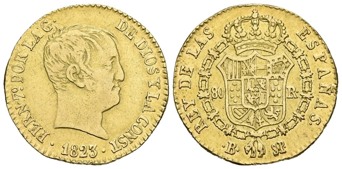 FERNANDO VII. 80 Reales. 1823. Barcelona SP. Tipo "Cabezón". Cal-174. Au. 6,69g. MBC. Escasa.